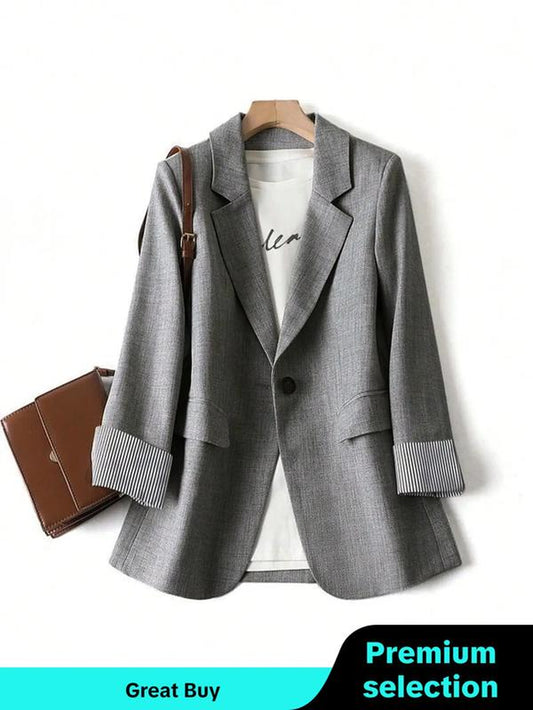 【Plus Size】 Striped Patchwork Print Button Front Blazer, Casual Flap Detail Lapel Neckline Outerw...