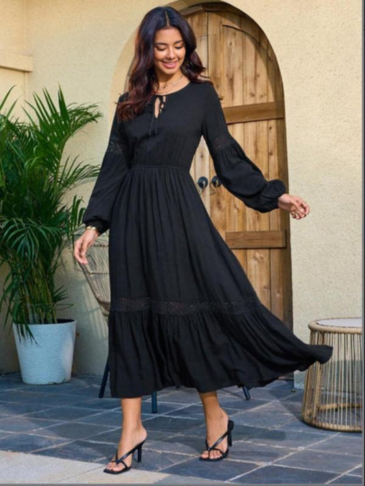 Women's Contrast Lace Bishop Sleeve Tie Neck A-Line Long Dress - Casual Flared Spring Dresses...