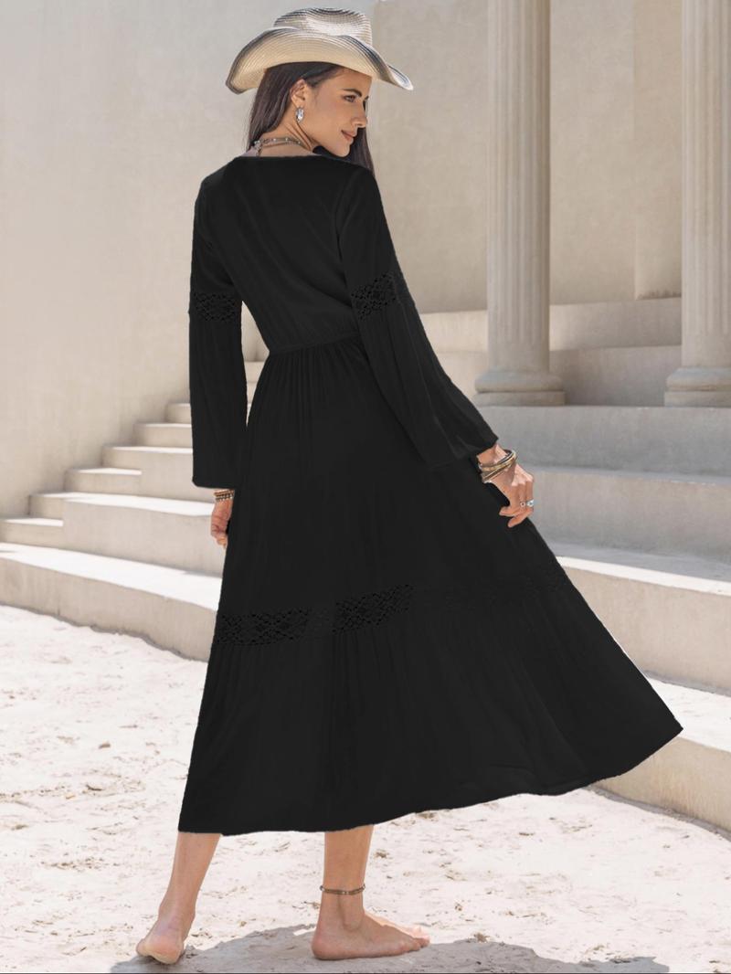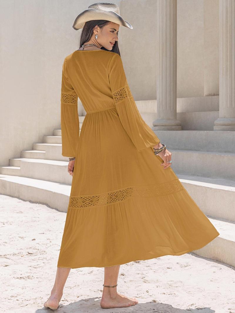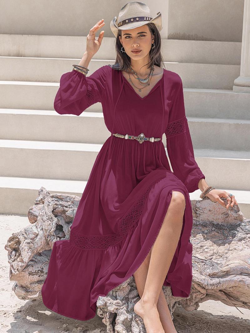 Women's Contrast Lace Bishop Sleeve Tie Neck A-Line Long Dress - Casual Flared Spring Dresses for Everyday Wear